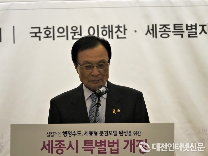 더불어민주당 대표이자 세종특별자치시를 지역구로 둔 이해찬 더불어민주당 대표는 세종시법 전부 개정안이 통과된지 6년만인 현재 세종시는 인구 13만에서 33만명으로 3배가량 늘었고, 예산규모도 1조원 가까이 증가했다며, 외형적으로로는 비약적인 발전을 이루었지만 실제는 그렇지 못하다고 지적하는 동시에 오늘 토론회를 통해 분권과 자치수준을 한단계 도약시킬 수 있는 안을 도출, 정부에 제안하면 집권여당인 더불어민주당도 문재인 대통령 국정과제가 꽃피울 수 있도록 공론화와 입법에 힘쓰겠다고 약속하고 있다. [사진-대전인터넷신문]