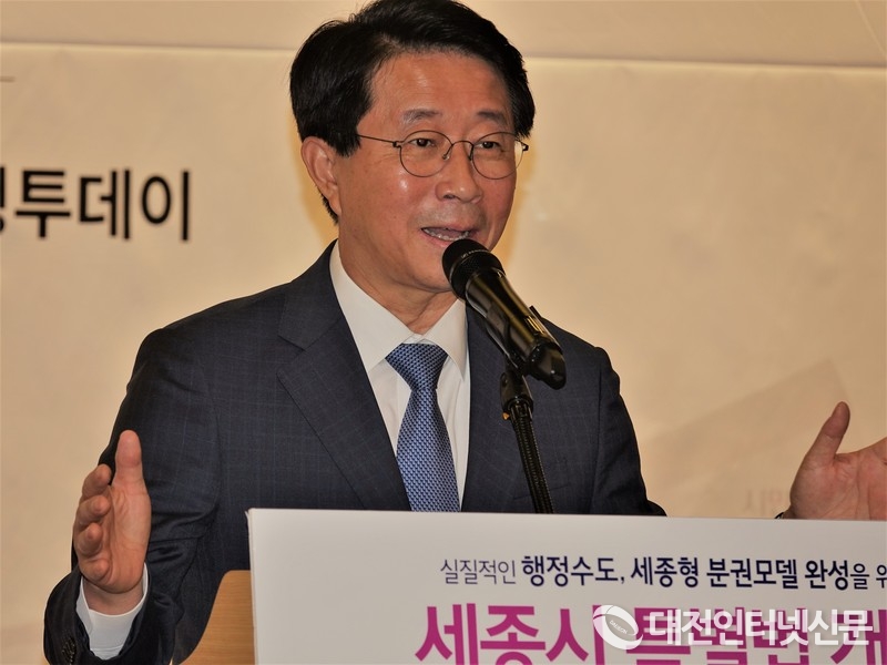 이춘희 세종시장이 발제를 통해 총 11개의 세종시법 개정에 대한 필요성을 밝히고 세종시가 자치분권의 성공모델로 우뚝 서기 위해서는 자치권 강화와 자립적 성장기반 마련이 반드시 필요하다고 강조하고 있다, [사진-대전인터넷신문]