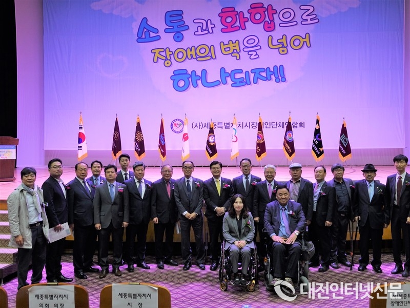 세종시 장애인 단체연합회 주관으로 16일 제39회 장애인의날 기념식장에서 장애인의 날을 축하하기 위해 참석한 내외빈들이 기념촬영을 하는 모습. [사진-대전인터넷신문]