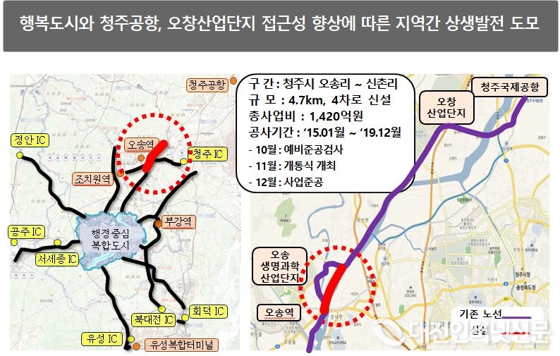 또한 행복청은 행복도시와 청주국제공항간 접근성 향상을 위해 시행한 ‘오송~청주공항 연결도로' 4.7km 구간을 11월 개통할 예정이고, 특히 ‘오송∼청주공항 연결도로'가 개통되면 신호교차로가 없는 왕복 4차로 4.7km 도로를 이용할 수 있어 거리는 3km, 시간은 약 10분 단축되는 효과가 있을 것으로 기대된다.