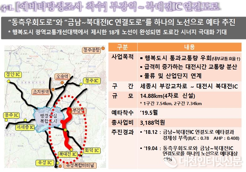 한편, 신규 예비타당성조사 대상사업으로, 행복도시 광역교통개선대책에 반영된 18개 노선 중 미착수된 ‘금남∼북대전IC 연결도로'와 '행복도시 동측우회도로' 2개 노선이 지난 4월에 선정되었다. 2개 노선을 하나의 사업으로 연계한 ‘부강역~북대전IC 연결도로'는 총 연장 14.9km의 왕복 4차로 도로로, 5월중 한국개발연구원에서 경제성 검토를 착수할 예정이다. 검토결과 경제성이 확보되면 행복청에서 설계와 공사를 시행하여 2026년 개통을 목표로 사업을 추진할 계획이다. ‘부강역~북대전IC 연결도로’가 개통되면 행복도시 통과교통량 우회를 통해 내부교통의 효율성이 높아질 것으로 기대된다.