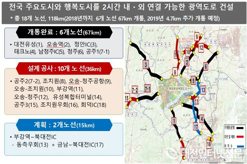 행복청은 총 2조 7천억 원을 투입하여 전국 주요도시를 행복도시로부터 2시간 내·외 접근 가능하도록 광역도로망을 구축하고 있다. 행복도시 광역도로는 2018년까지 6개 노선 67km(57%)가 개통됐고, 2019년에 10개(설계 3, 공사 7) 노선을 추진하고 있으며 향후 2개 노선을 계획하고 있다고 17일 밝혔다.
