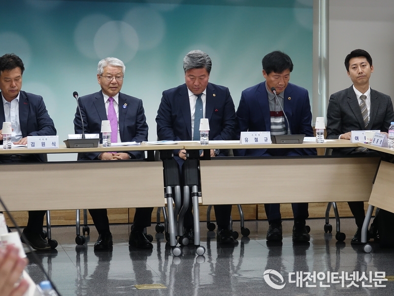 지역경재활성화를 위한 지역 건설업계와의 간담회에 참석한 서금택 의장이 지역의 목소리에 의회차원의 협조를 약속하였다. 사진은 간담회에 참석한 서금택 의장과 차성호 산건위원장, 김원식, 유철규, 이태환 의원이 참석 지역업체 등의 애로사항을 경청하고 있다. [사진-대전인터넷신문]