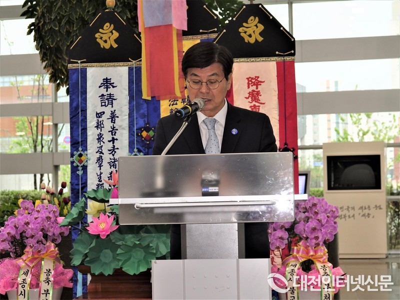 불기 2563년 부처님 오신 날을 맞아 세종시청에 마련된 점등식에서 점등의 의미를 밝히고 잇는 이춘희 세종시장. [사진-대전인터넷신문]