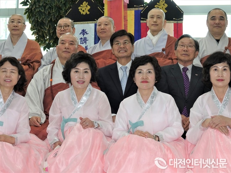 불기 2563년 부처님 오신 날 점등식 후 단체촬영하는 세종 사암연합회 불자들과 내빈들이 자축하고 기념촬영하는 모습. [사진-대전인터넷신문]