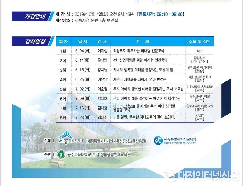 [대전 인터넷신문=세종/박미서기자] 세종시가 6월 4일부터 7월 23일까지 매주 화요일 오전 10시 시청 여민실 에서 관내 유치원과 초등학교 자녀 학부모를 대상으로 지난 2016년부터 4년째 진행 중인 교양강좌로, 매 기수 학부모들의 뜨거운 관심과 성원 속에서 세종시교육청과 공주교육대학교와 공동으로 ‘제8기 세종 학부모대학’을 운영한다.