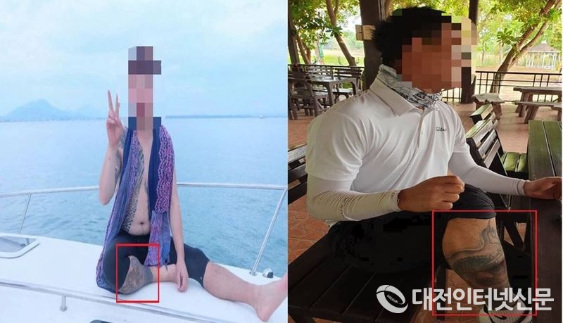 한국인터폴이 사전에 확보한 밀항피의자 사진. 다리부분에 선명한 용문신이 있는 모습과 오른쪽 검거당시 피의자 다리에 있는 동일한 용문신으로 검거의 결정적 단서가 된 사진. [사진제공-경찰청]