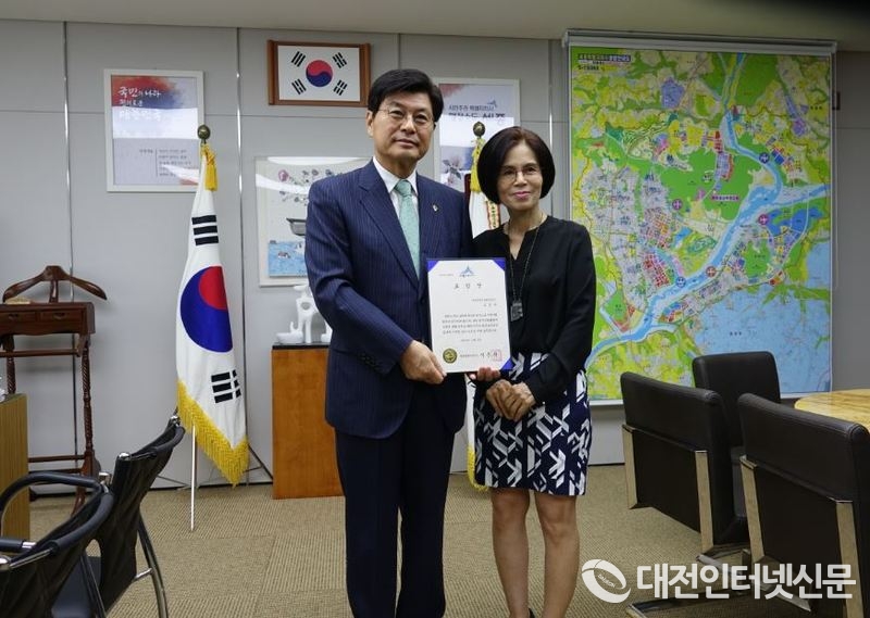 표창 수여 후 이 시장과 기념촬영하는 세종숲해설가협회 오해경. [사진-대전인터넷신문]