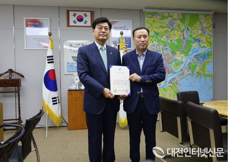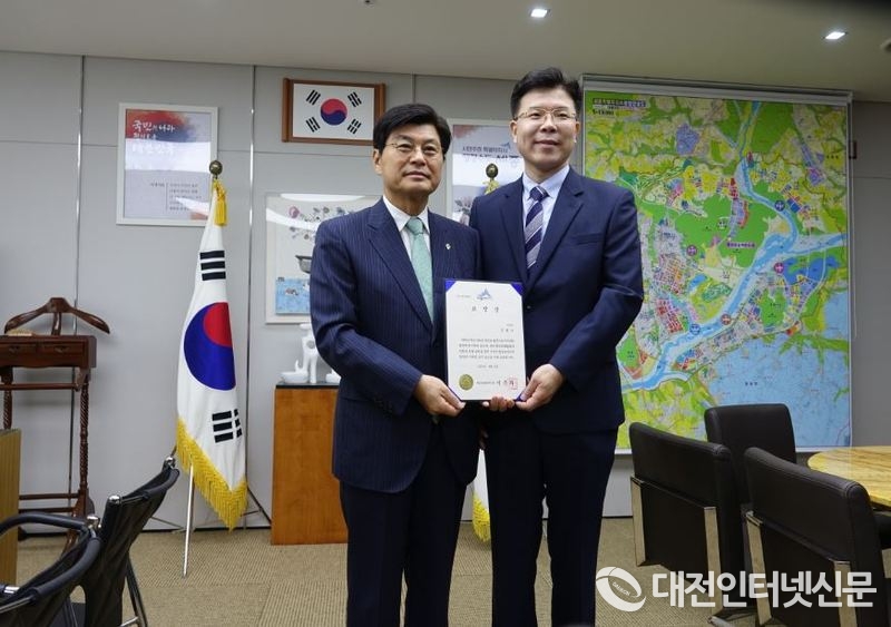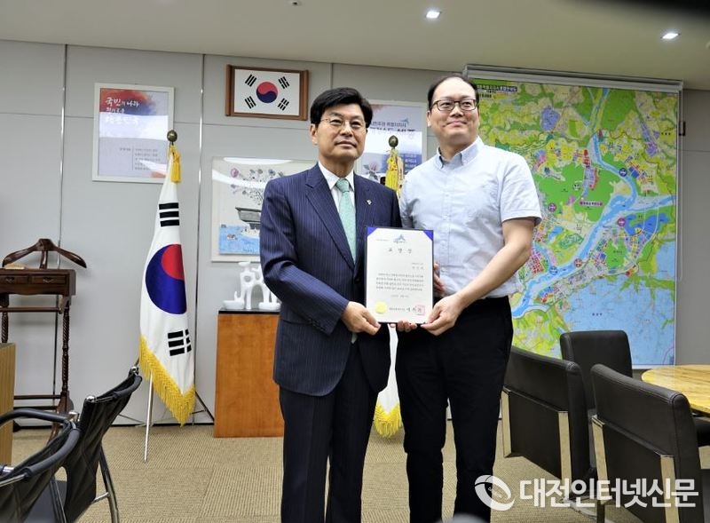 표창 수여 후 이 시장과 기념촬영하는 현대앨엔씨 권병교. [사진-대전인터넷신문]