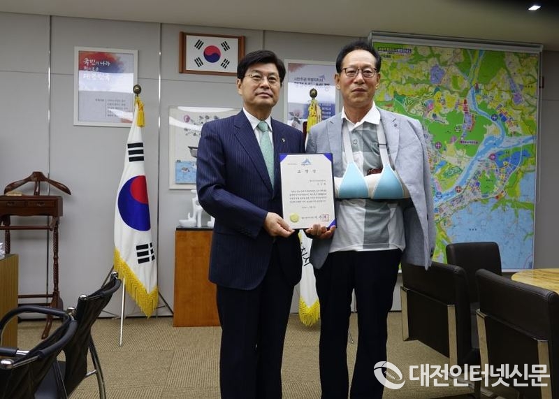 표창 수여 후 이 시장과 기념촬영하는 세종친환경생활지원센터 조성주, [사진-대전인터넷신문]