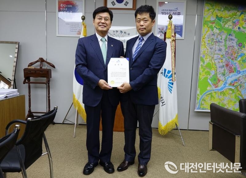 표창 수여 후 이 시장과 기념촬영하는 세종지속가능발전협의회 손국배. [사진-대전인터넷신문]