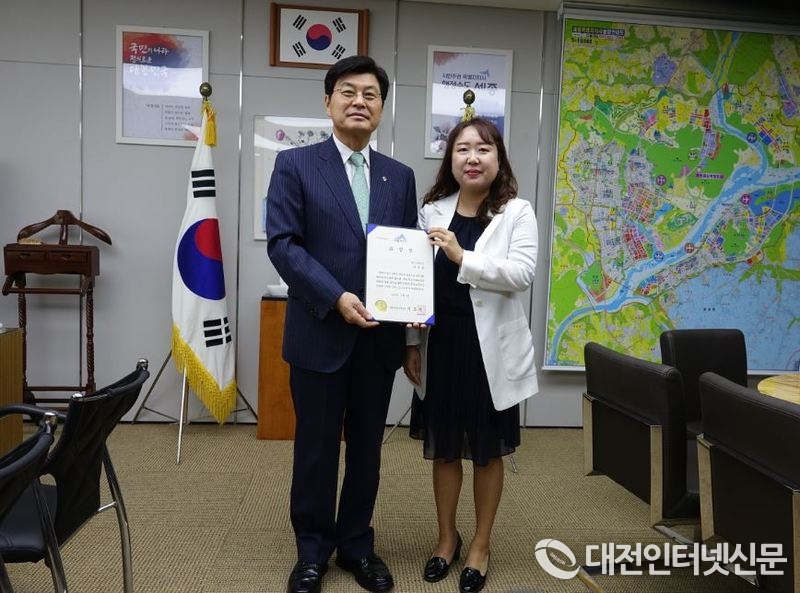 표창 수여 후 이 시장과 기념촬영하는 대전세종연구원 이윤희 세종연구실 연구위원. [사진-대전인터넷신문]