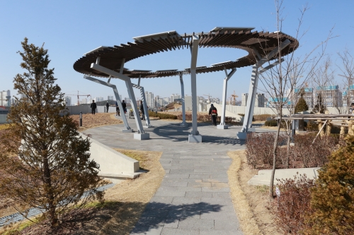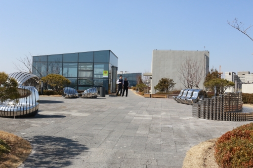 옥상정원은 ▲가장 높은 곳에서 청사 전체경관을 조망하는 전망마루 ▲허브의 향기 속에서 심신을 정화하는 향기마루 ▲식이식물과 유실수가 가득한 건강마루 ▲다양한 식물을 익히고 체험하는 체험마루 ▲정겨운 새소리가 가득한 소리마루까지 다양한 녹지공간으로 조성됐다.