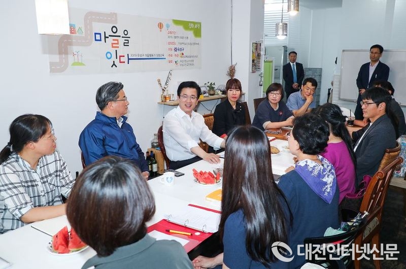 허태정시장이 노은1동 마을공동체 소소한 연구소을 찾아 담소을 나누고 있다(사진제공-대전시청)