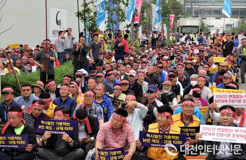 [대전인터넷신문=세종/최대열 기자] 서울 개인택시운송조합 회원 500여 명이 19일 정부세종청사 국토교통부 앞에 집결 차량공유 서비스인 ‘타다’ 운행이 불법이라며 국토부를 향해 철저한 택시 유사영업 행위를 관리 감독할 것을 요구하였다.