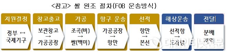 운송 절차는 보관창고에 비축된 원료곡(벼)을 가공공장에서 쌀로 도정하고, 포장한 후 국내 운송 우리나라 선적 항구에서 선적하는 동시에 검역․훈증을 거친 후 출항(선적 항구 인계)하는 FOB 해상운송 방식으로 세계식량기구(WFP)에 전달할 예정이다.