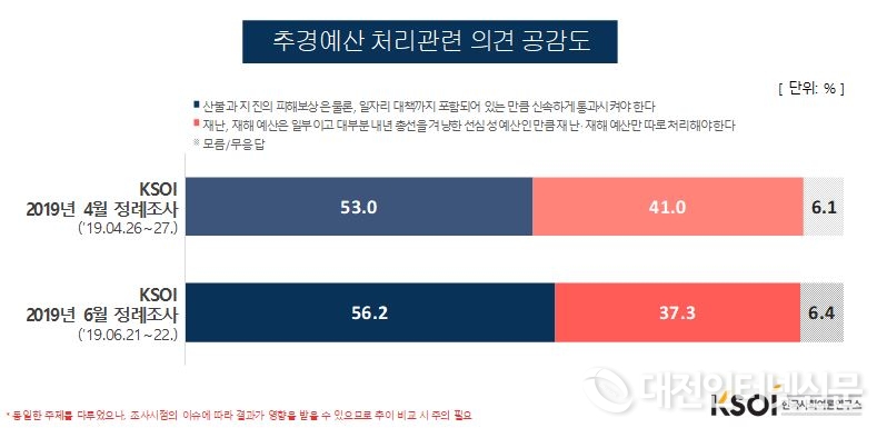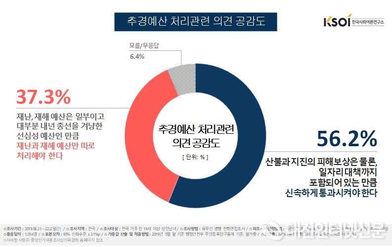 이처럼 추경예산안 처리가 지연되고 있는 것과 관련해 한국사회여론연구소(KSOI)가 6월 21일과 22일 이틀에 걸쳐 전국 만 19세 이상 성인 남녀 1,014명을 대상으로 실시한 6월 정례조사에서‘추경예산안 처리방안’에 대해 질문한 결과 ‘산불과 지진 피해보상은 물론, 일자리 대책까지 포함되어 있는 만큼 신속하게 통과시켜야 한다’는 주장에 공감한다는 의견이 56.2%로 지난 4월 정례조사 결과 53.0%에 비해 3.2%P 더 높아진 것으로 나타났다.