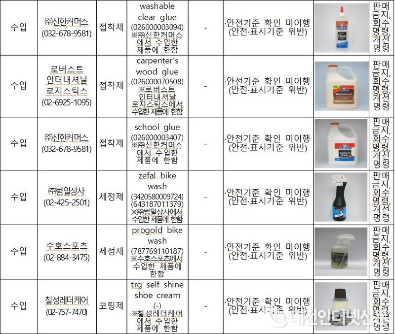 환경부 안전·표시기준 위반 23개 생활화학제품 판매 중지 및 회수 조치 - 폼알데하이드 기준치 초과한 접착제, 안전·표시기준 위반한 세정제, 코팅제, 방향제, 염료, 초