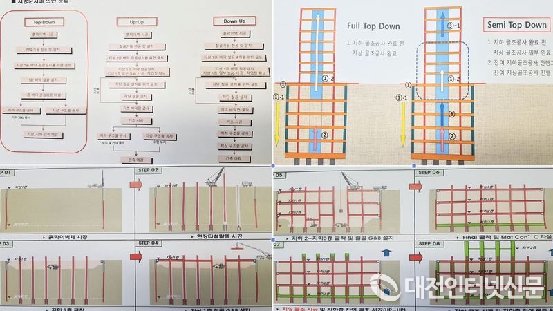 대림산업이 시공 중인 탑다운 공법은 굴착공사 이전에 흙막이 벽체, 지하층 철골 기둥을 선시공하고, 단계별로 슬래브와 토공사를 위아래로 반복하여 지하구조물을 형성하는 공법으로 기존 터파기 공법으로 진행하기 어려운 대단 면, 대심도 굴착에 활용되며, 특히 인접 건물이 많은 도심지 구간에서의 안정적으로 적용 가능한 지상과 지하의 동시 시공으로 공사 기간을 단축할 수 있는 장점이 있는 공법이다.