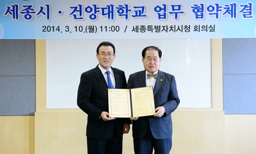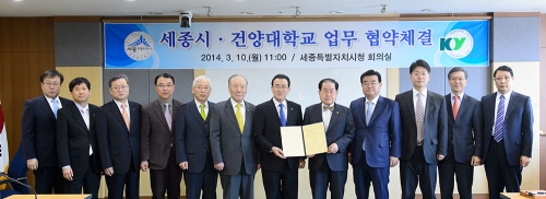 세종특별자치시(이하 세종시, 시장 유한식)와 건양대학교(총장 김희수)가 10일 오전 11시 세종시청 회의실에서 양 기관의 협력 및 공동발전을 도모하기 위한 업무 협약을 체결했다.