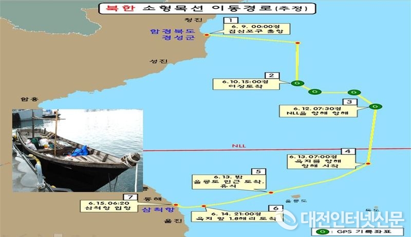 이후 북한 소형목선은 13일 07시 경부터 육지를 향해 항해를 시작하여 13일 밤 울릉도에서 30∼40마일 떨어진 해상에 도착하였고, 파도가 높아 물닻을 내리고 휴식을 취한 후, 14일 아침 다시 출발하여 21시 경 육지로부터 1.8해리(3.3km)지점에 도착, 야간에 접안하면 암초에 부딪칠 것을 우려하여 물닻을 내리고 휴식을 취한 후, 15일 06시 20분 경 삼척항에 입항했으며,총 이동거리는 약 700km, 이동경로와 관련된 GPS 기록은 4곳 이라고 밝혔다.