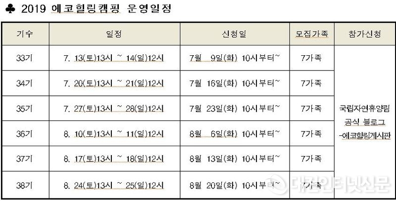 [대전인터넷신문=대전/박향선기자] 안전하고 올바른 캠핑문화를 확산하고 야외활동을 통해 가족 간의 소통과 화합을 도모하기 위한 ‘2019 에코힐링캠핑’이 강원도 춘천 용화산자연휴양림에서 1박2일의 일정으로 7월 13일부터 8월 25일까지 개최된다.