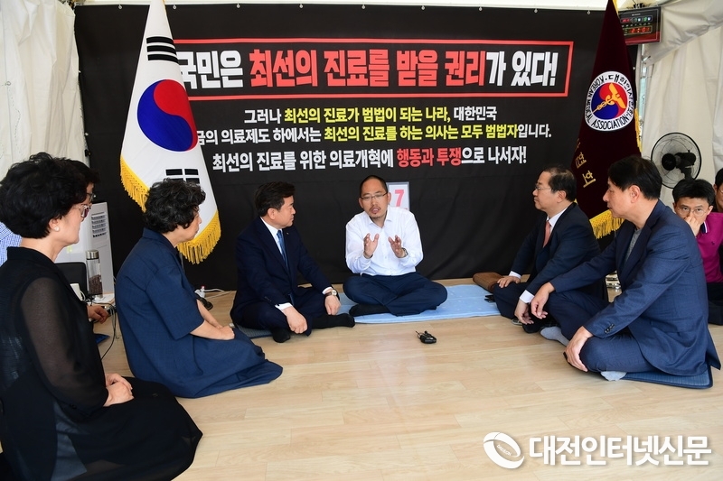 [대전 인터넷신문=대전/창길수 기자] 김철수 대한 치과의사협회장, 김대업 대한 약사회장과 신경림 대한 간호협회장 이하 ‘3개 단체장’ 은 8일 오후 2시 단식 7일째를 맞은 최대집 대한의사협회장을 방문 단식을 결정할 수밖에 없었던 현 상황에 대한 위로와 함께 무엇보다 건강이 중요함을 강조하며 단식을 중단할 것을 권고하였다.