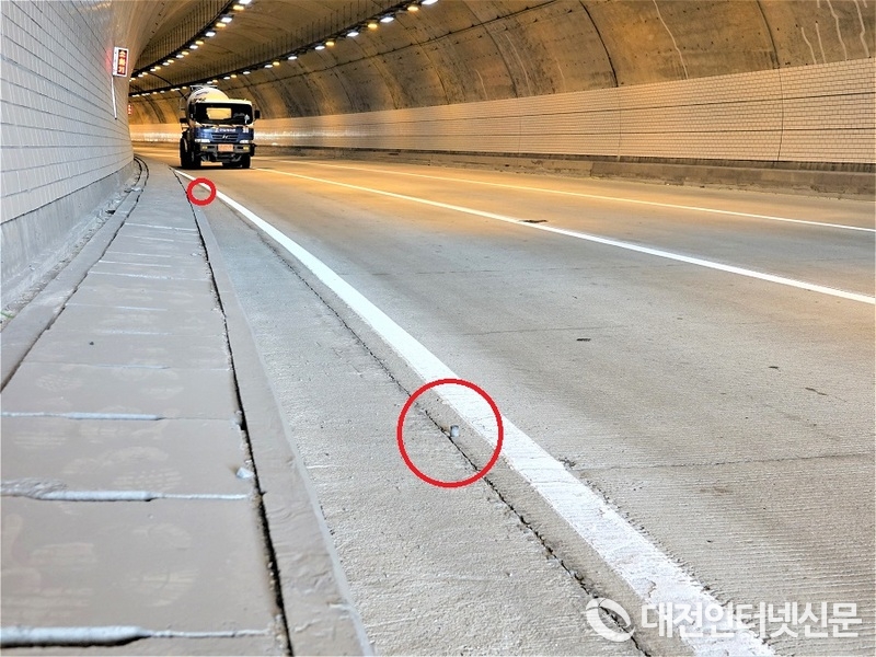 터널 내 차선을 식별하기 위해 설치된 도로표지병의 상판이 지나는 차량에 의해 파손되면서 하단 고정부의 철재파이프가 도로에 그대로 노출되어 운전자의 생명을 위협한 부강터널 전경. [사진-대전인터넷신문]