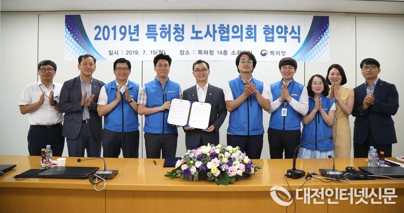 박원주 특허청장(왼쪽 2번째)과 정성진 특허청 노동조합 위원장(왼쪽 1번째)이 협약서에 서명 후 기념촬영을 하고 있다.(특허청)