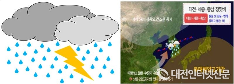 이번 장맛비는 대기 상층(고도 5km 이상)의 건조한 공기와 대기 하층(고도 1.5km 이하)의 습한 공기가 충돌하여 불안정이 강해지는 대전·세종·충남지역 중심으로 매우 많은 비가 내릴 것으로 기상청은 전망했다.