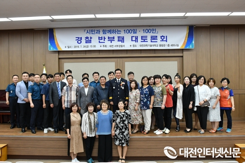 [대전 인터넷신문=대전/창길수 기자] 대전 서부 경찰서는 7. 26(금), 대전 과학기술대학 동방과 세미나실에서 국민의 신뢰를 회복하기 위해 시민과 경찰이 함께 참여해 유착비리 근절에 대해 각계각층의 의견을 수렴하고 경찰 유착비리 근절 및 청렴도 향상을 위해 시민과 함께하는 100日·100人 ‘반부패 대토론회’를 개최했다.