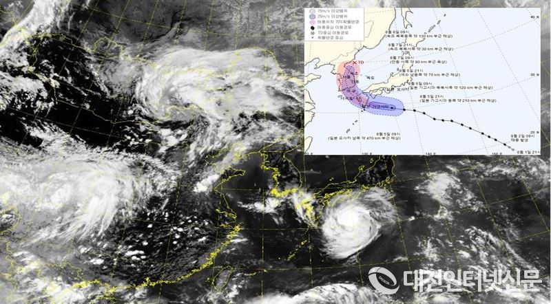 한반도 인근 태풍 위성 사진과 태풍의 예상 진로도.(사진-기상청)