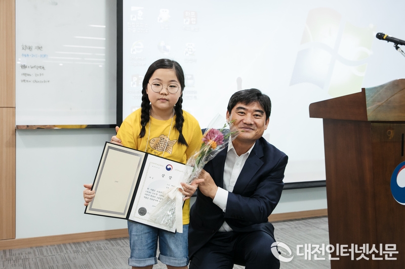 교육부 주명환 기획조정실장과 대상을 수상한 8살(여) 김지오 어린이.(사진-교육부)