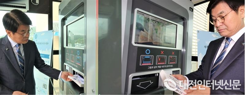 이춘희 시장이 이마트 세종점에 설치된 U-도서관에서 도서 대출 서비스를 시연하고 있다. [사진-대전인터넷신문]