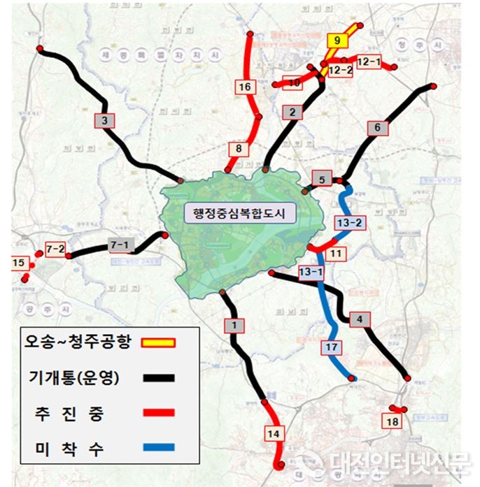 행복 도시 광역도로는 총 18개 노선으로 구성되어 6개 노선이 기 완료되어 운영 중에있고, 2019년 현재 10개 노선이 추진 중이며 2개 노선은 사업추진을 위한 예비타당성조사를 시행하고 있다.
