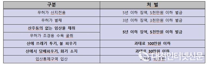 [대전 인터넷신문=대전/박미서기자] 산림청은 추석 연휴를 전후로 산을 찾는 사람들이 많아짐에 따라 임산물 불법채취가 증가할 것으로 예상하여 9월 16일부터 10월 31일까지 집중단속을 추진한다.