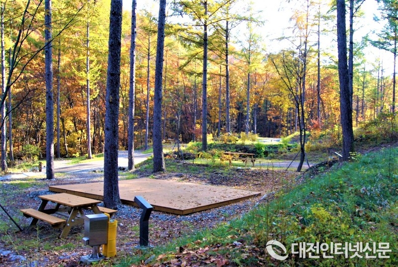전기배전함, 피크닉테이블 등이 위치한 국립화천숲속야영장 데크사이트의 모습(사진-산림청)