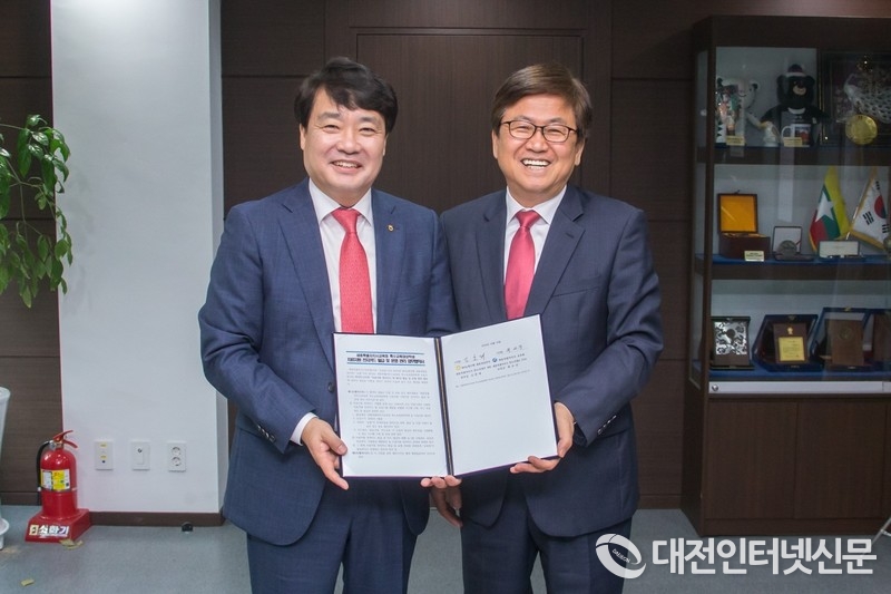 최교진 세종시교육감(사진 오른쪽)과 김훈태 NH농협은행 세종영업본부장(사진 왼쪽)이 협약서를 들어보이고 있다.(사진-세종시교육청)