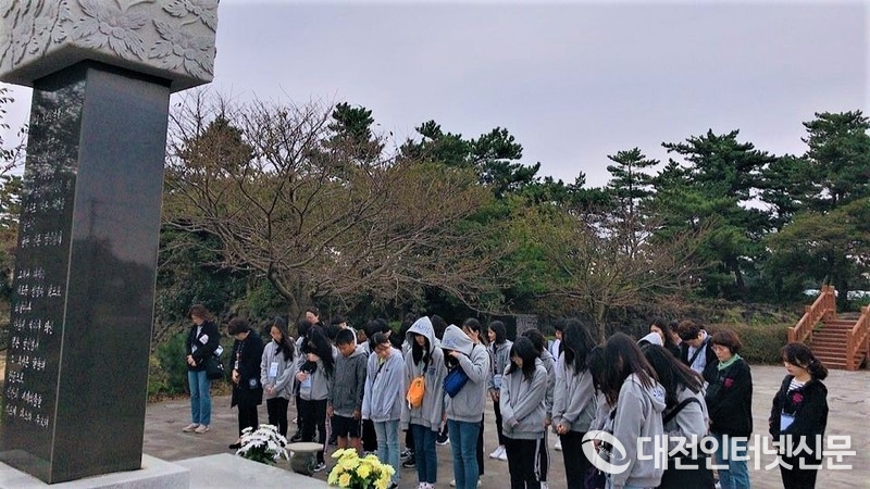 세종시교육청이 지난 14일부터 16일까지 2박 3일간 제주도 일원에서 교육복지선도학교 초등학생을 대상으로 「제주 역사·생태체험 공동캠프」를 진행했다. 사진은 학생들이 역사의 현장을 찾아 묵념하고 있는 장면 (사진-세종시교육청)