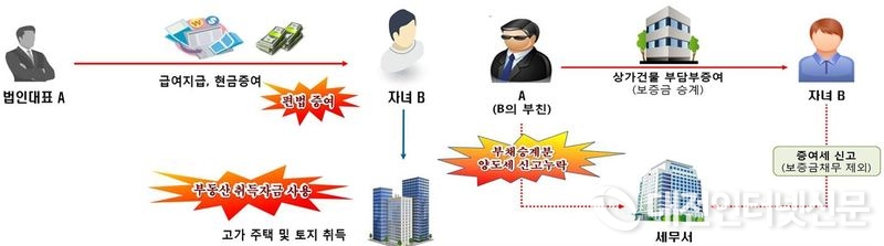 신고소득이 높지 않은 30대 B는 고액재산가인 부친 A로부터 현금을 편법증여 받아 고가 부동산을 매입하고 호화 생활을 하면서 증여세를 신고하지 않았고, 특별한 소득이 없는 B는 방송연예인 배우자 A로부터 고액의 현금을 편법증여 받아 부부 공동명의로 고가 아파트를 취득하고 증여세를 신고하지 않았으며, 0대 직장인 B는 건설업을 운영하는 부친 A가 외조모 명의의 계좌에 입금한 자금을 수차례 현금으로 찾아 부동산 취득자금으로 사용하고 증여세를 신고하지 않은 것으로 조사 되었다.