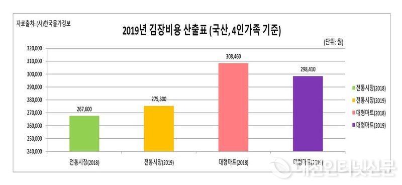 [대전인터넷신문=세종/최요셉기자] 올해 4인 가족 기준 김장비용은 전통시장이 약 27만 5,000원, 대형마트는 약 29만 8,000원의 비용이 드는 것으로 조사됐다.