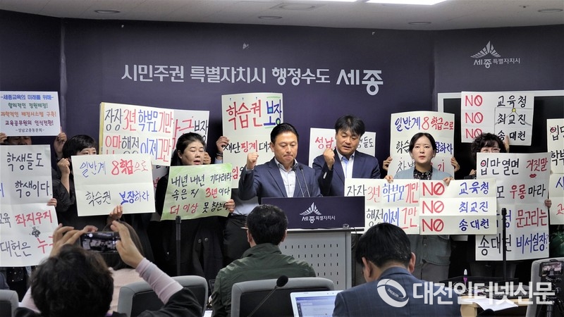 세종시 관내 성남고 학부모회와 운영위원회를 비롯한 총동문회 소속 30여 명이 지난 10일 세종시 교육청의 잘못된 고교평준화 정책으로 차별받고 있는 아이들을 지켜달라며 언론의 관심과 지지를 당부하는 기자회견을 개최하는 모습. [사진-대전인터넷신문]