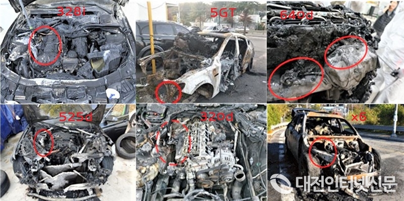 국토부와 한국교통안전공단이 최근 수도권에서 화재가 발생한 BMW 328i(10.27), 5GT(10.28), 640d(10.29 EGR 리콜대상), 525d(10.29 EGR 리콜대상), 320d(11.01 EGR 리콜대상), X6(11.03,)에 대한 화재원인 조사 결과 화재원인이 제각각인 것으로 나타났다. [이미지-대전인터넷신문]]