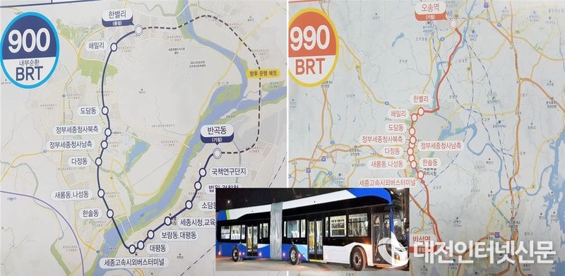 세종시 1호 굴절버스가 성능시험과 구간 실증을 위한 시범운행을 하는 노선도. [사진-대전인터넷신문]