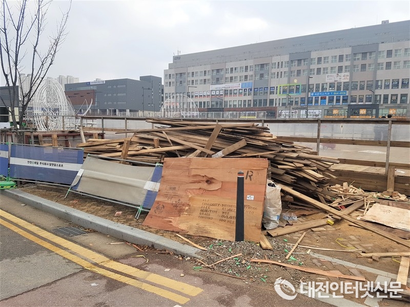 위험천만의 자재들이 아무렇게나 방치되면서 불안감을 조성하는 현장. 언젠가는 시민이 시청을 방문하는 민원인이 이용할 인도 위에 자재와 쓰레기가…. [사진-대전인터넷신문]