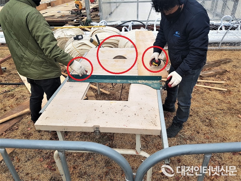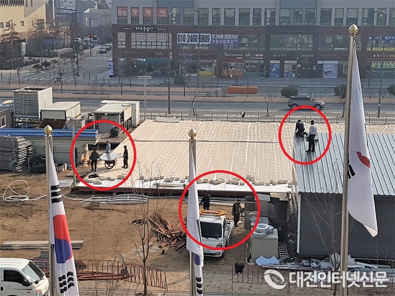 시청 앞 잔디광장에 설치 중인 야외스케이트장 설치공사에 안전모와 안전띠를 장착하지 않은 체 강행하는 공사에 대한 우려가 커지고 있다. 사진은 아무런 안전장비도 착용하지 않은 체 지붕 위에서 공사하는 작업자들. [사진-대전인터넷신문]