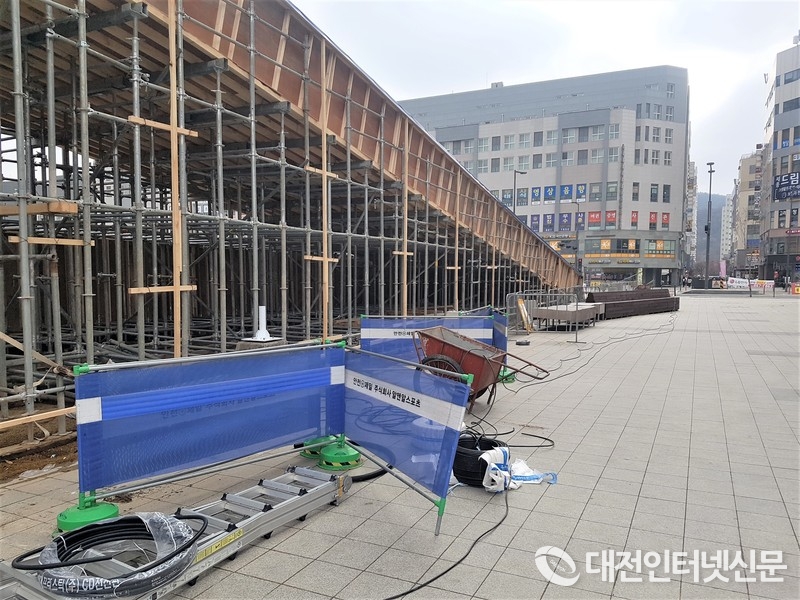 대다수의 시청공무원이 출퇴근하고 점심시간에 주로 이용하는 인도임에도 공사장과 인도를 분리하는 경계가 설치되지 않은 채 방치된 모습. 작업중 혹여 못이라도 튄다면…. [사진-대전인터넷신문]
