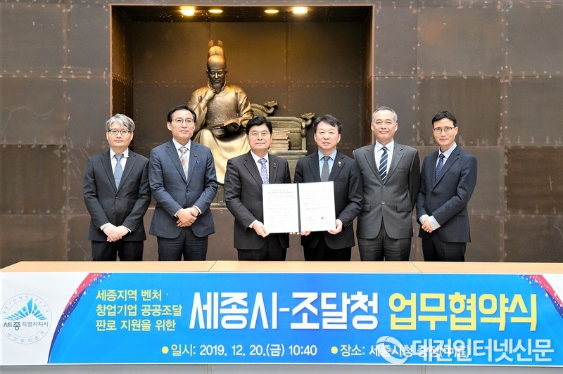 [대전인터넷신문=세종/최요셉기자] 세종특별자치시와 조달청이 12월 20일(금) 오전 세종시청 4층 중정에서 세종시 관내 창업·벤처기업이 개발한 신제품의 판로확대를 위한 업무협약(MOU)을 체결했다.