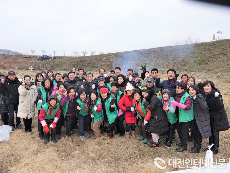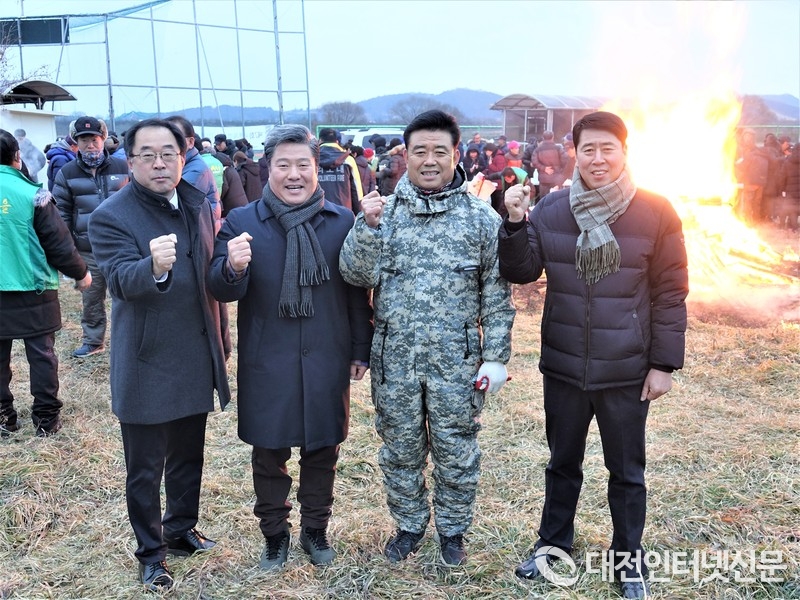 묵은 때는 훌훌 털어버리시고 새해 복 많이 받으십시오! 2020년 파이팅을 외치는 홍순제 면장, 차성호 의원, 김학용 농업부시장, 김병민 조합장 [사진-대전인터넷신문]