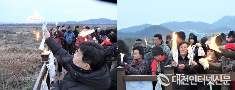 동이 트기도 전 새벽에 도착한 연서면 주민들이 모닥불 앞에 모여 송구영신하는 모습. [사진-대전인터넷신문]